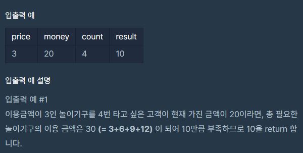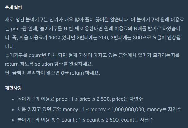 놀이기구를 count번 타게 되면 현재 자신의 money에서 얼마가 모자라는지 리턴하기