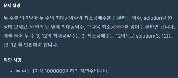 최대공약수(gcd)는 재귀함수로 구하며, 최소공배수(lcm)는 (두 수의 곱) / (최대공약수)로 구할 수 있다